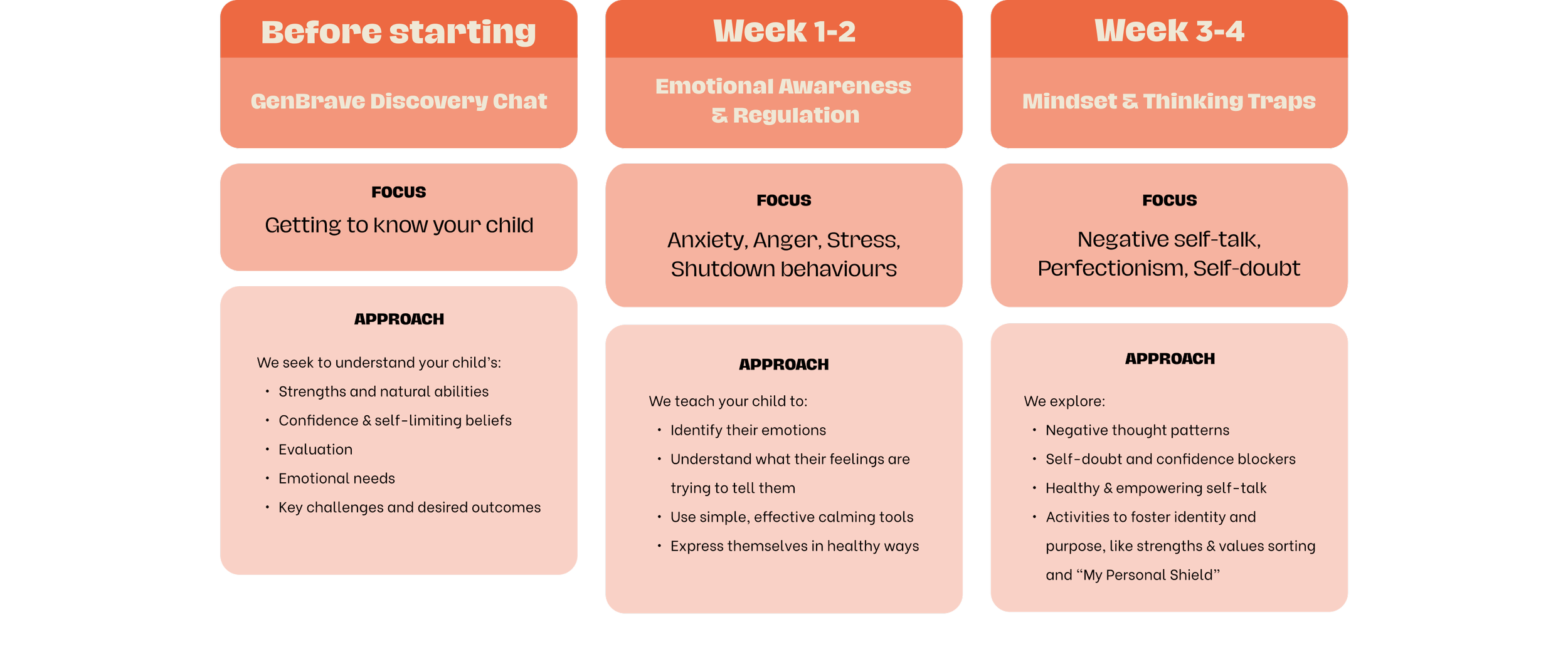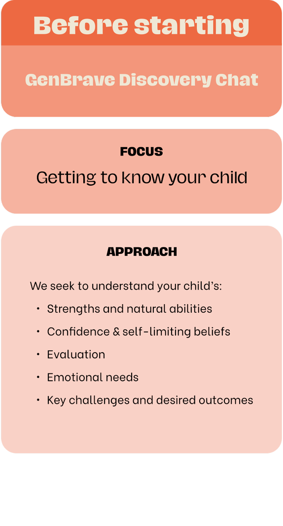 GenBrave Academy offers emotional and resilience coaching programmes for children aged 6 – 18. Together with you and your child, we turn “I can’t” into “I’ve got this,” so your child can shine in everything they do.