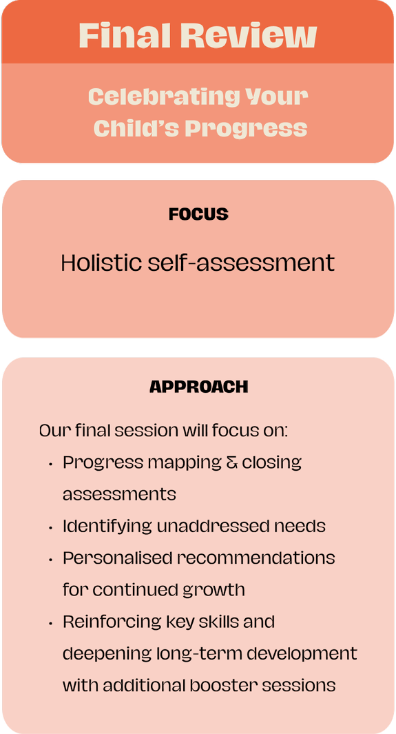 Most families start noticing bigger behavioural changes after 4 sessions. Some report fewer shutdowns and outbursts from their child, resulting in clearer communication with the adults and peers in their life. Others express more confident, collaborative attitudes — and are more disciplined to follow through on their goals.